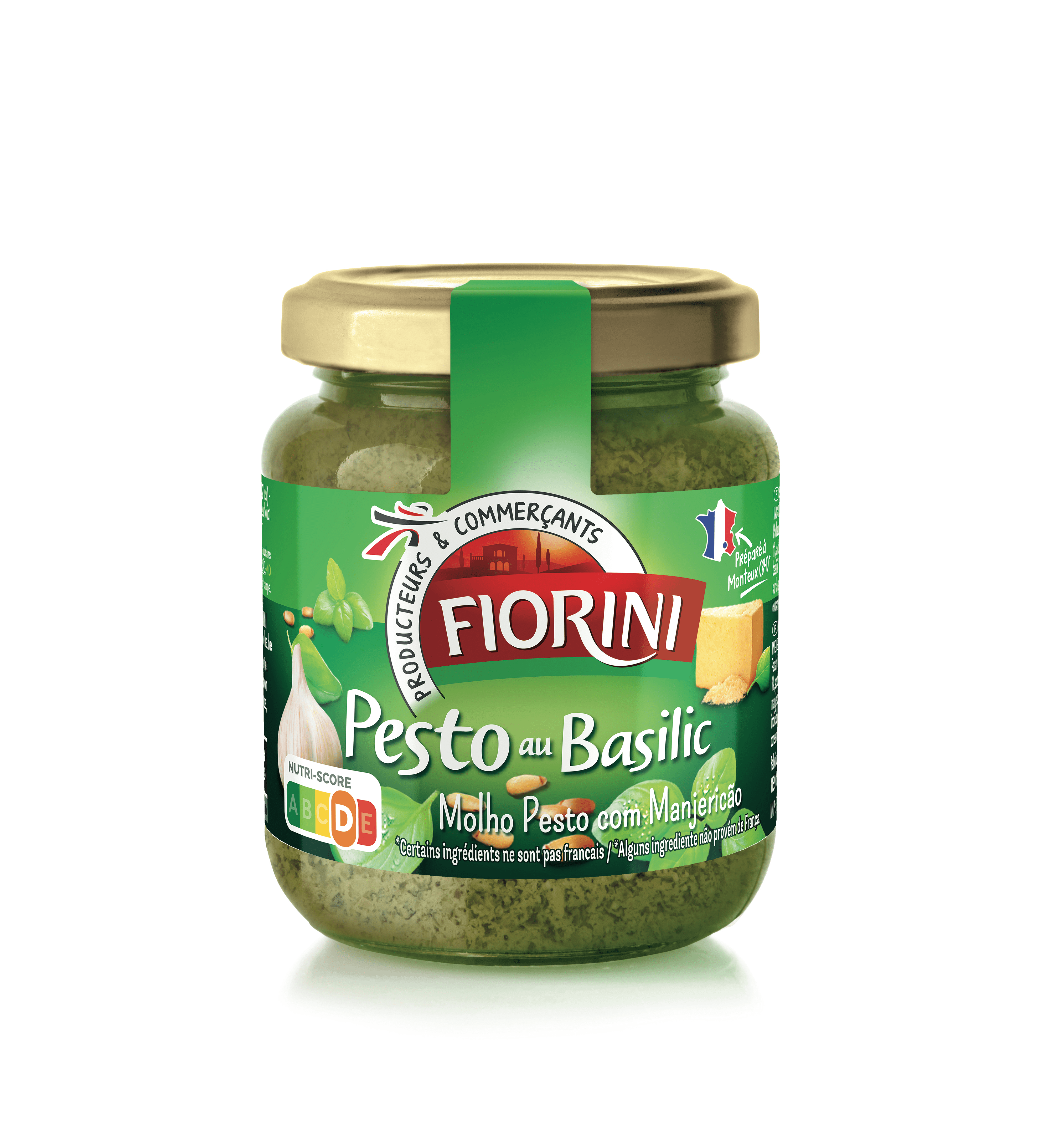 Basilic 31,8%, huile de tournesol, pomme de terre, eau, FROMAGE* râpé 4%, GRANA PADANO* 3% (contient LYSOZYME d'OEUF), sucre, sel, huile d'olive vierge extra 2,1%, NOIX DE CAJOU, ail 1%, acidifiants : acide lactique et acide ascorbique, pignon de pin 0.5%, poivre, arôme naturel de basilic. * dont LAIT.