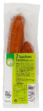 Viande de porc 87%, eau, sel, gras de porc ; stabilisants : triphosphates, diphosphates ; épices et plantes aromatiques, dextrose ; antioxydants : érythorbate de sodium, acide ascorbique ; Arômes, conservateur : nitrite de sodium. Boyau collagénique (collagène, glycérine, cellulose). elaboré à partir de porc origine UE.