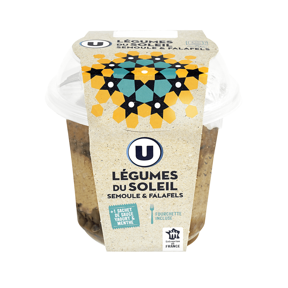 Semoule de blé dur réhydratée, légumes et falafels frits 250g : Semoule de BLÉ dur réhydratée 45% (semoule de BLÉ dur 22%, eau), falafel frit 18% [pois chiche cuit 5% (pois chiche sec, eau, sel), oignon réhydraté (eau, oignon déshydraté), CRÈME (CRÈME, stabilisant : carraghénanes), farine de BLÉ, eau, protéines et amidon de BLÉ (GLUTEN de BLÉ, amidon de BLÉ), huile de tournesol, OEUF entier en poudre, pulpe d ail, sel, coriandre, persil, poudres à lever (diphosphates, carbonates de sodium, amidon de BLÉ), cumin, curcuma, poivre blanc], aubergine grillée 6%, courgette grillée 6%, oignon préfrit 6% (oignon, huile de tournesol), poivron jaune 6%, poivron rouge 6%, huile de tournesol, sel, menthe, cannelle, cumin, poivre. Pourcentages exprimés sur la semoule de blé dur réhydratée, légumes, et falafels frits. Sauce au yaourt et à la menthe 30g : Eau, huile de colza, YAOURT nature 10%, vinaigre d'alcool, amidon de maïs, jaune d OEUF, menthe 2%, sel, persil, ail, épaississant : gomme xanthane, poivre, conservateur : sorbate de potassium. Pourcentages exprimés sur la sauce au yaourt et à la menthe. Certains ingrédients de ce produit ne proviennent pas de France.