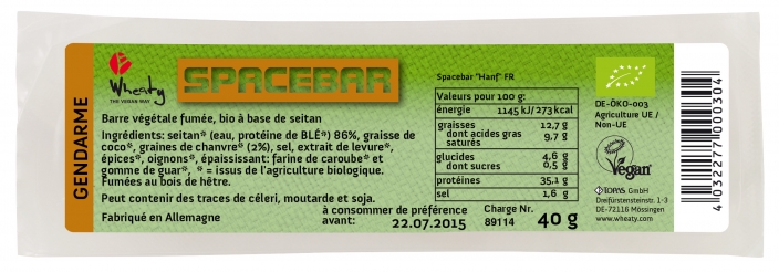 seitan* (eau, protéine de BLÉ*) 86%, graisse de coco*, graines de chanvre* (2%), sel, extrait de levure*, épices*, oignons*, épaississant: farine de caroube* et gomme de guar*, fumée**. * = issus de l'agriculture biologique. **= Fumées au bois de hêtre. Contient du gluten.