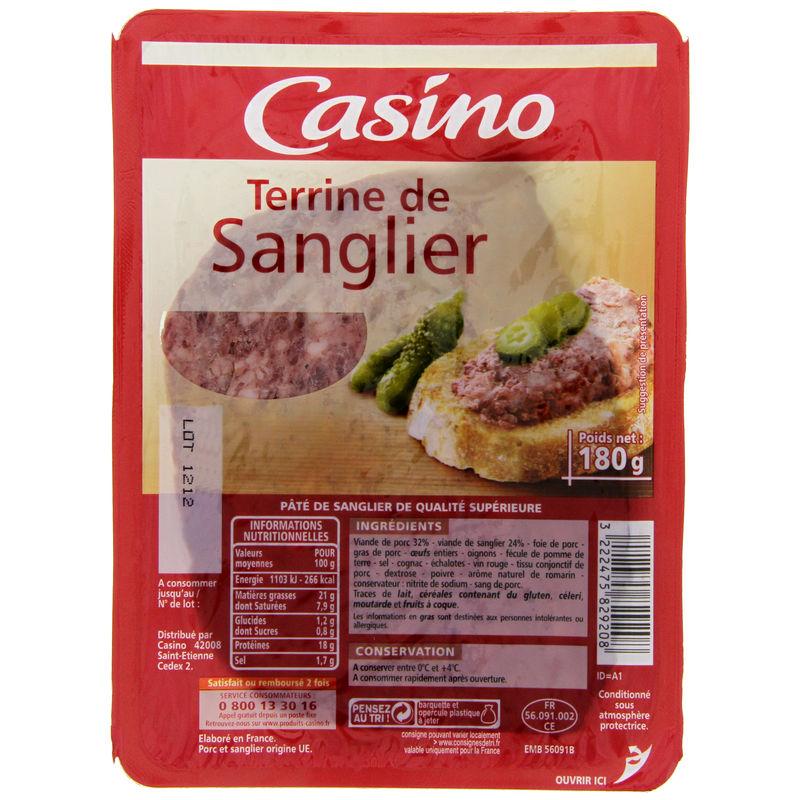 Viande de porc 32% - viande de sanglier 24% - foie de porc - gras de porc - œufs entiers - oignons - fécule de pomme de terre - sel - cognac - échalotes - vin rouge - tissu conjonctif de porc - dextrose -poivre - arôme naturel de romarin - conservateur : nitrite de sodium - sang de porc.  Les informations en gras sont destinées aux personnes intolérantes ou allergiques.