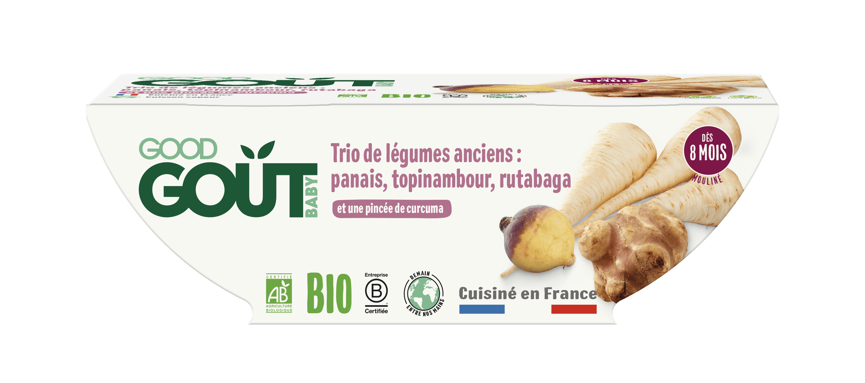 31% panais bio, eau, 21,8% topinambour bio, 16% rutabaga bio, 2,1% fécule de manioc bio, 0,1% huile de tournesol bio, 0,07% curcuma bio.