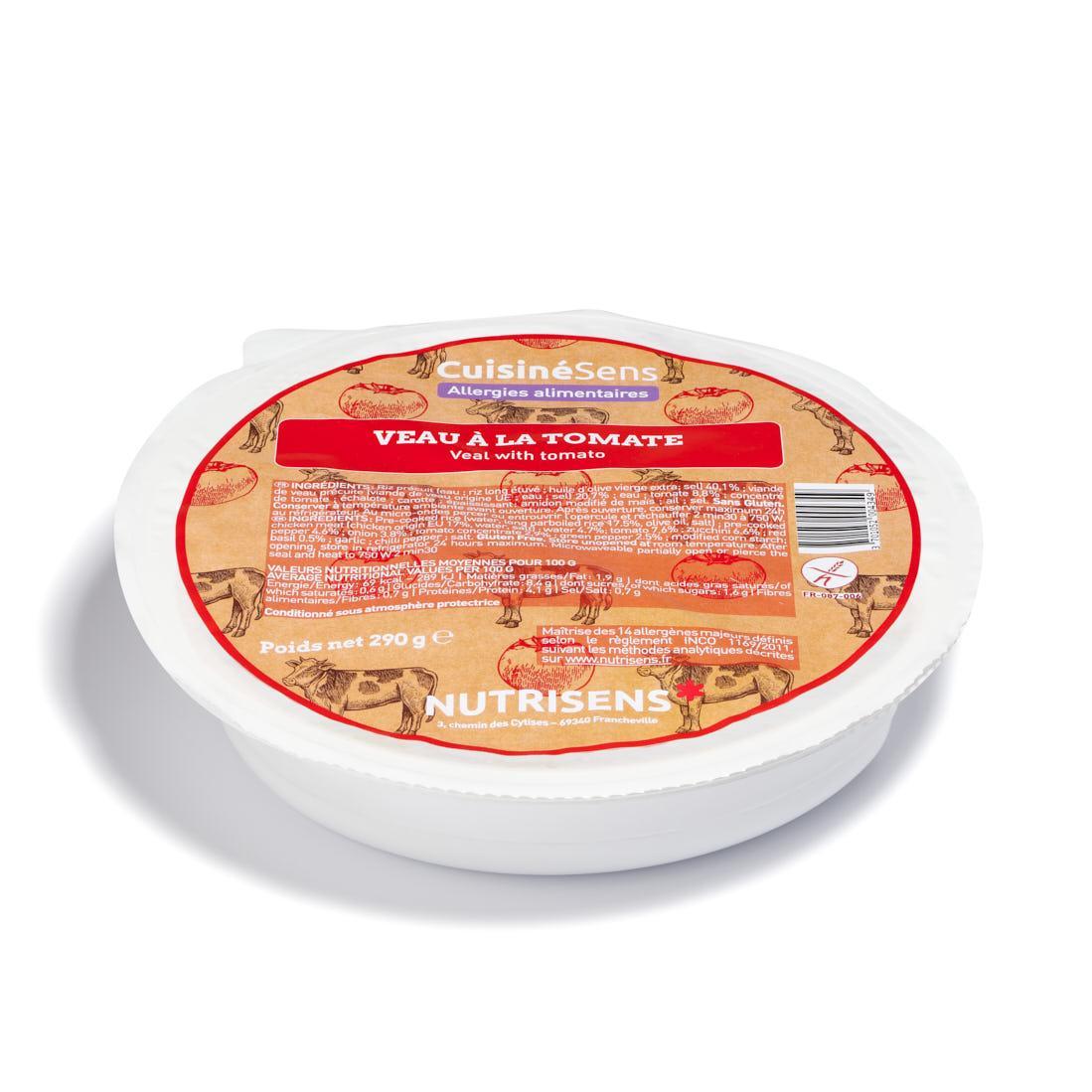 Riz précuit 43,5 % (riz, eau, huile d'olive, sel), viande de veau précuite 22% (veau, eau, sel), eau, tomate 8,5%, concentré de tomate, échalote, champignon, carotte, amidon modifié de maïs, ail, sel, sucre.