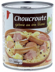 Choucroute 46 %, eau, saucisses et saucisson fumés 16% (gras et couenne de porc*, eau, pièce de tête de porc*, viande de dinde*, plasma de porc, protéines de BLÉ (contient GLUTEN), sel, amidon de pois, stabilisant : triphosphates, arômes naturels, gélifiants : carraghénanes - gomme guar - gomme xanthane, sirop de glucose, coriandre en poudre, colorant : extrait de paprika, antioxydant : acide ascorbique, conservateur : nitrite de sodium), viande de porc traitée en salaison et précuite 6% (viande de porc*, eau, sel, stabilisant : triphosphates, gélifiant : algues euchéma transformées, conservateur : nitrite de sodium), pommes de terre 5% (pommes de terre, antioxydant : acide ascorbique, conservateur : DISULFITE de sodium), saindoux, vin blanc 1%, sel, antioxydant : acide ascorbique, arôme naturel, baies de genièvres et grains de poivre. pourcentages exprimés par rapport au poids net total.