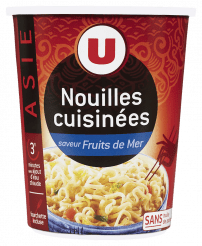 Nouilles 88,4% : farine de BLÉ, huile de son de riz, amidon de tapioca et de pomme de terre, sel, correcteurs d'acidité : carbonate de sodium et carbonate de potassium, épaississant : gomme guar. Assaisonnement 11,6% : sucre, légumes déshydratés (carotte, chou, feuille d'oignon, ail), sel, maltodextrine, poivre, exhausteurs de goût : inosinate disodique et guanylate disodique, arôme, extrait de levure, CREVETTES en poudre 0,1%, acidifiant : acide malique, huile de son de riz.