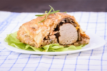 Dérouler la pâte feuilletée, déposer un lit de champignons, placer le filet mignon au centre et refermer la pâte feuilletée.