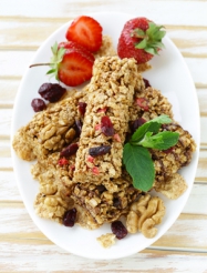 Pour une dizaine de barres environ: 200 g  de flocons sarrasin - 100 g de riz soufflé (non sucré) - 50 g de quinoa soufflé - 40 g de cranberries - 40 g de raisins secs - 40 g d'abricots secs coupés petits dés - 40 g de noisettes concassées  - 150 g de miel  - 50 ml d'huile tournesol - 1 cuillère à soupe de sucre