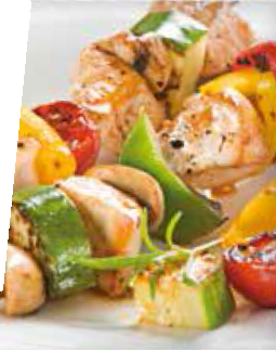 150g d’aiguillettes de poulet grillé Fleury Michon - 4 pics à brochettes - 4 champignons de Paris frais - 1 poivron jaune - 1 poivron vert - 4 tomates cerises