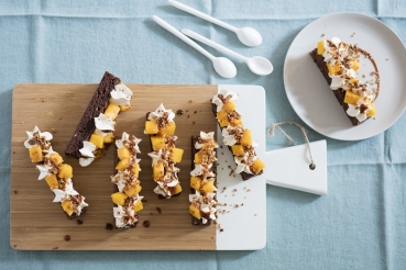 1 Brownie Chocolat Noisettes - 20 cl de crème liquide - 1 cuil. à soupe de mascarpone - 4 cuil. à soupe de caramel au beurre salé - 50 g de pralin en grains - 1 mangue