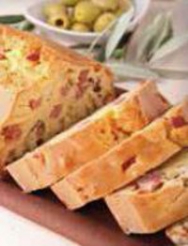 1 jambonneau Fleury Michon - 120g de farine de riz complet - 30g de farine de maïs - 1 sachet de levure chimique sans gluten - 6 cuillères à soupe de fécule de maïs - 80 cl d’huile d’olive - 15 cl de vin blanc - 10 tomates séchées Bio - 10 olives vertes dénoyautées - Sel, Poivre - Thym