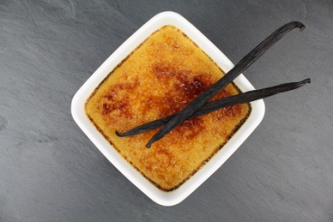 500 ml de lait de soja - 500 ml de crème de soja - 10 œufs - 125 g de sucre en poudre - 2 gousses de vanille - 25 g de sucre roux