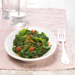 1 sachet de Pousses d'Epinards Bonduelle (100g) - 2-3 cuil. à soupe d'huile végétale - 1 cuil. à café de cumin en graines - 1 boîte de tomates pelées (400 g.), hachées grossièrement - 1 cuil. à café de coriandre moulu - 1 grosse pincée de curcuma moulu - Une pincée de piment de cayenne ou piment d'espelette - Sel