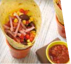 150g d’allumettes de jambon Fleury Michon - 1 boîte de haricots rouges - 1 petite boîte de maïs - 1 poivron rouge - 1 tomate - 2 cuillères à soupe d’huile d’olive - Piment doux en poudre - Paprika - Sel, Poivre - 140g de farine de maïs - 250g d’eau - 1 cuillère à soupe de fécule de maïs - 2 pincées de sel