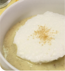 1 œuf extra frais - 15 g de sucre (10 + 5 g) - 10 g de fécule de maïs - 1/4 de gousse de vanille - 120 mL d’eau minérale - 3 mesurettes de poudre Althéra® ou Alfamino®