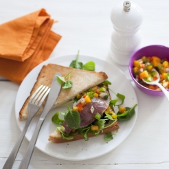 Pain de mie Maxi Tranches Nature Jacquet - 1 tranche de thon cru - Marinade (6 cuillères à soupe d'huile d'olive, 3 cuillères à soupe de sauce soja, 1 cuillères à soupe de jus de citron, 1 cuillère à soupe gingembre en poudre (facultatif) - Rougail (1 tomate, ½ poivron rouge, jaune et vert, ½ mangue, ½ oignon, ½ concombre) - Persillade (ail, persil, huile d'olive, sel, poivre) - Salade