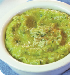 Au bout de 5 min, ajoutez les courgettes et les raisins. Lorsque les légumes sont cuits, mixez-les avec l’huile et le cumin, ajoutez la semoule et laissez gonfler 5 min.