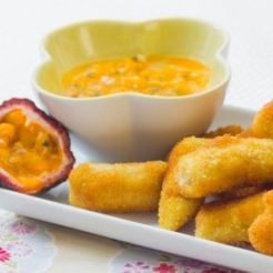 1 boite de petites quenelles à la volaille - 1 œuf -  50 g de farine - 50 g de chapelure - 1 c. à café de curcuma - 4 fruits de la passion - 75 ml de vinaigre de pomme - 50 g de sucre - 1 c. à soupe de jus de citron - Huile de friture