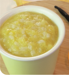 80 g d’ananas frais - 10 g de riz rond - 1/2 gousse de vanille - 90 mL d’eau minérale ou de source convenant à l’alimentation du nourrisson - 3 mesurettes de poudre Althéra® ou Alfamino®