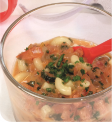 Mélangez l’eau, le concentré de tomate, les mesurettes, le miel et l’huile. Ajoutez les dés de tomates, les coquillettes et le basilic ciselé finement.